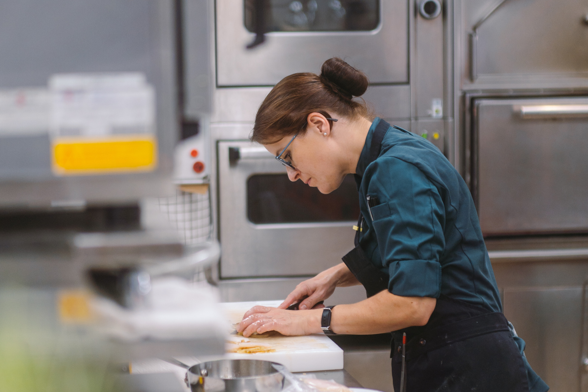 Die Gäste nehmen an einer gemeinsamen Tafel mitten im Geschehen Platz und erleben ein sorgfältig komponiertes Vier-Gang-Menü mit saisonalen Produkten, kreativer Finesse und der unverkennbaren Handschrift der Küchenchefin.