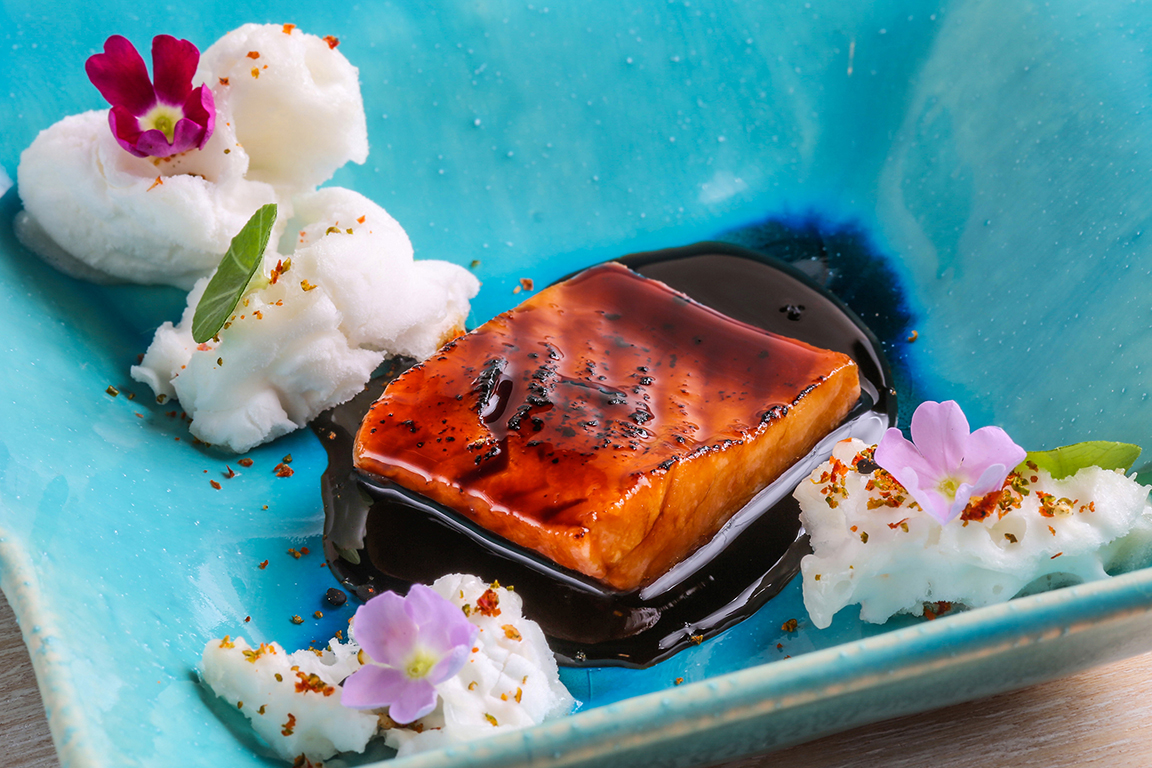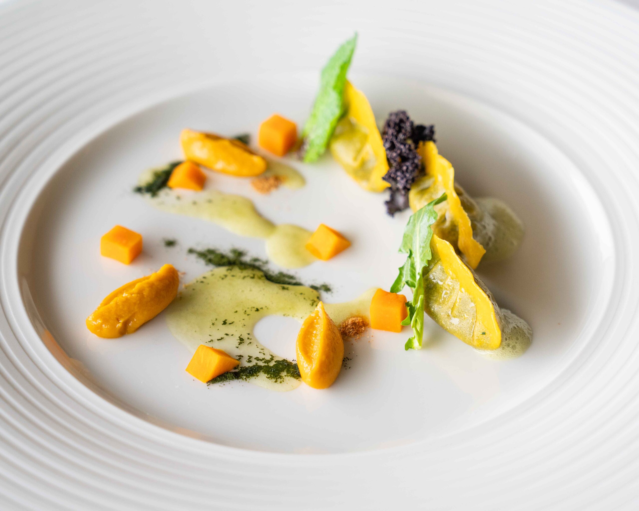 Auf dem Teller zeigt sich dies als moderne Interpretation mit tiefem Respekt für kulinarische Traditionen und handwerkliches Erbe. Als ehemaliger Gewinner des Ethical Cuisine Trophy von Relais & Châteaux spielt Nachhaltigkeit eine zentrale Rolle. So bietet das Degustationsmenü auch eine rein pflanzliche Variante, treffend benannt als „Ethical Vegan Cuisine“.