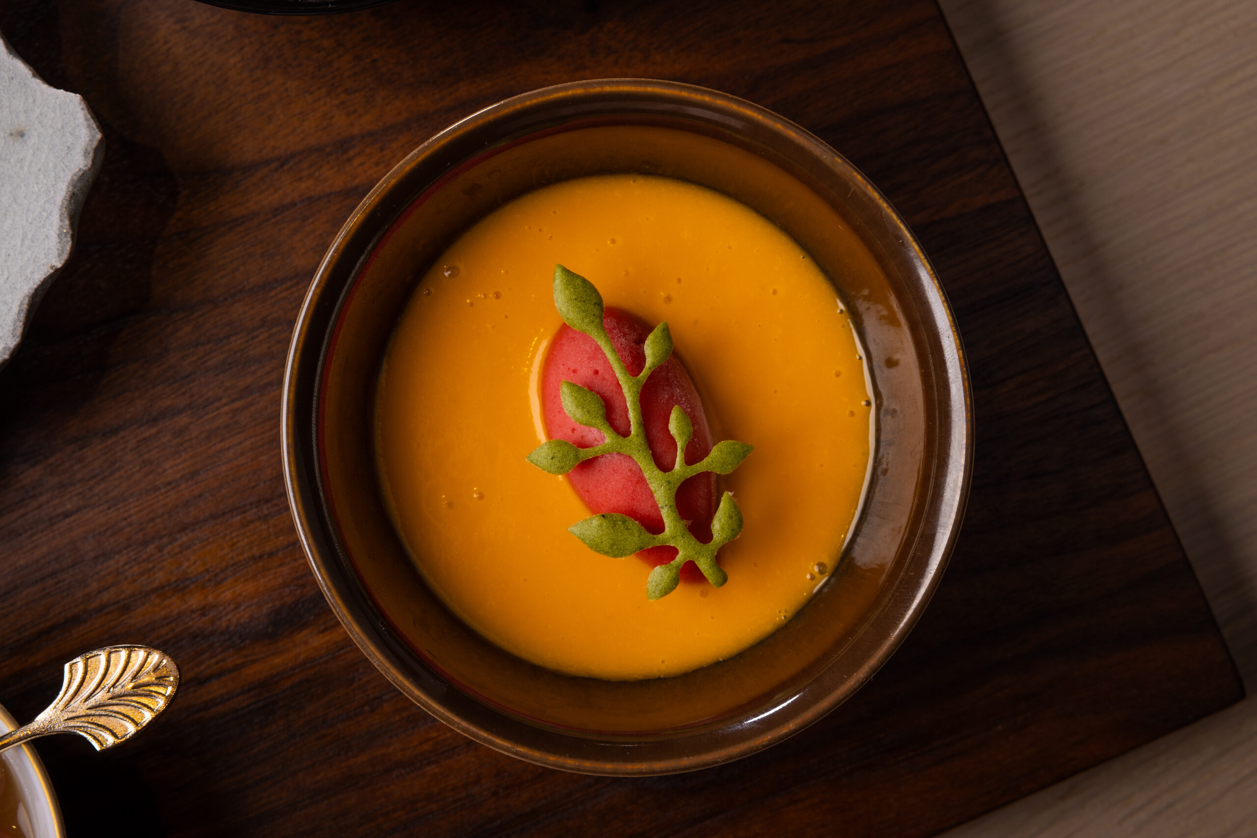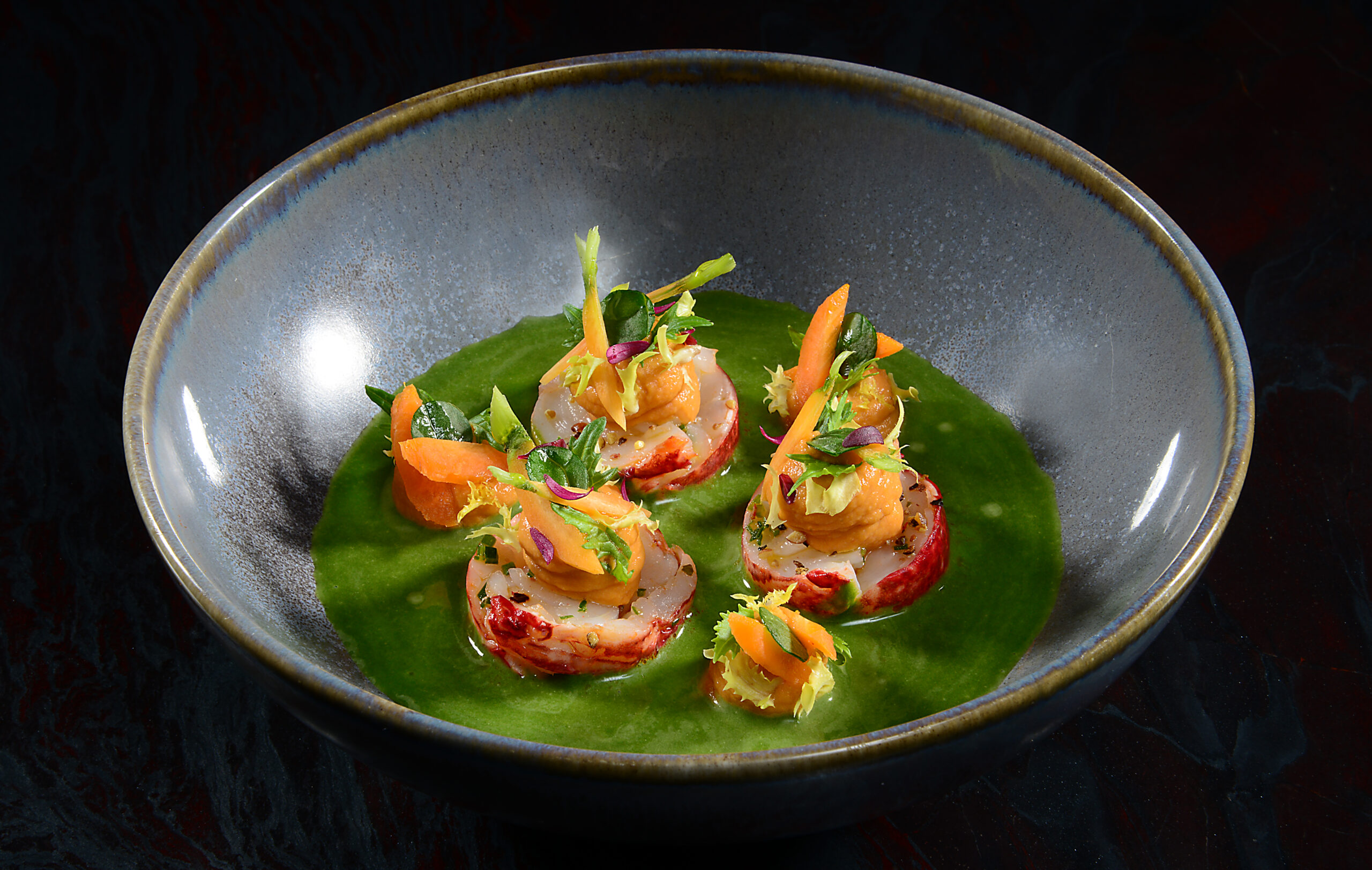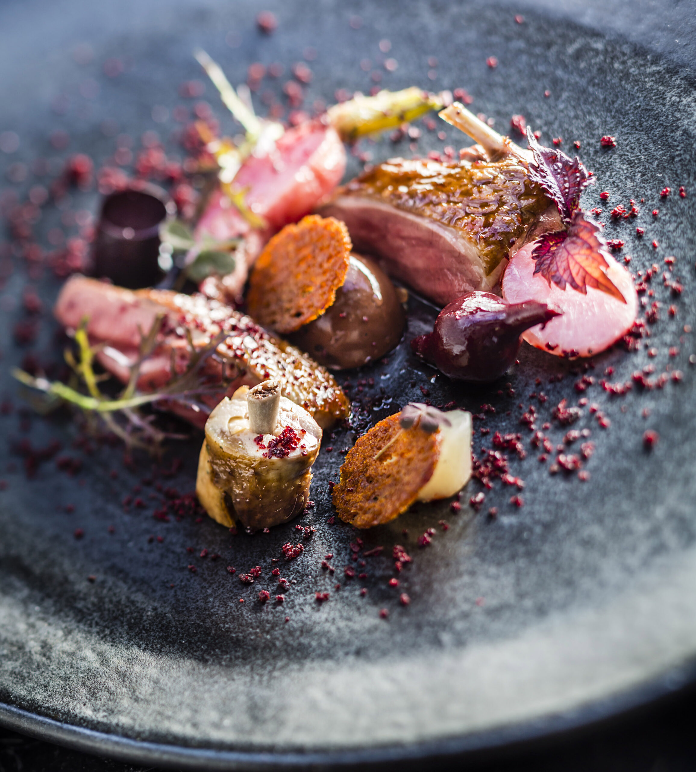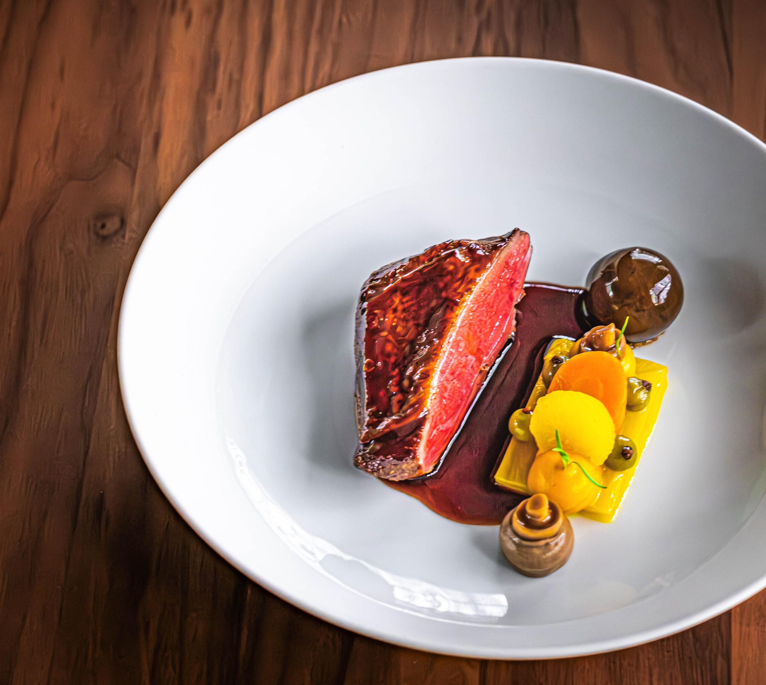 Ein Ausdruck seiner kreativen Handschrift und technischen Brillanz ist etwa Foie Gras in eleganten Perlen, bestäubt mit Blutorangenpulver und serviert auf einem würzigen Chutney aus Grain Nobles – ein Gericht, das sowohl den Gaumen überrascht als auch das Auge verführt.