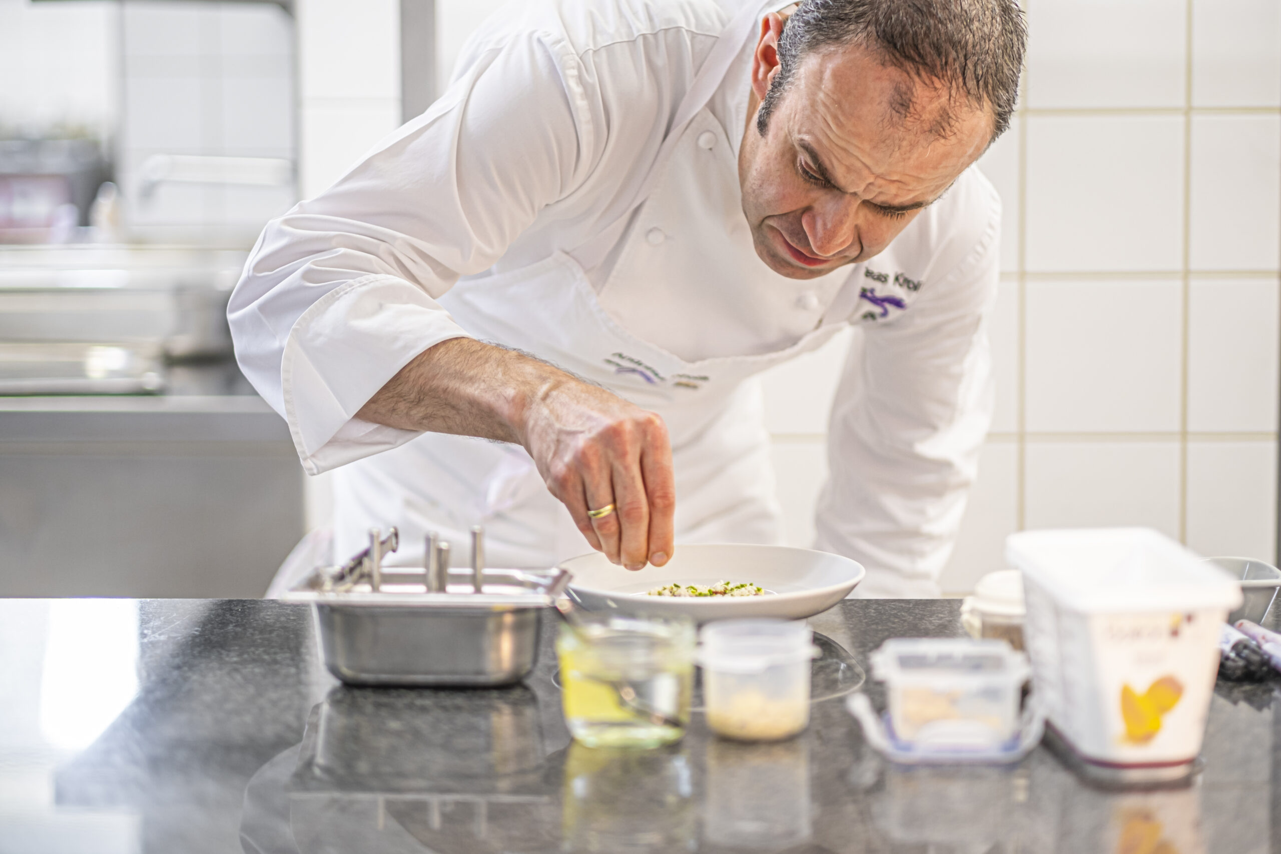 Seine Gerichte stehen in direkter Verbindung zur umliegenden Landschaft: Sie spiegeln die Natur, die man von den Tischen aus betrachtet, wider und machen den Besuch der Maison Décotterd zu einem sinnlichen Erlebnis, das kulinarischen Genuss mit kontemplativer Tiefe vereint.