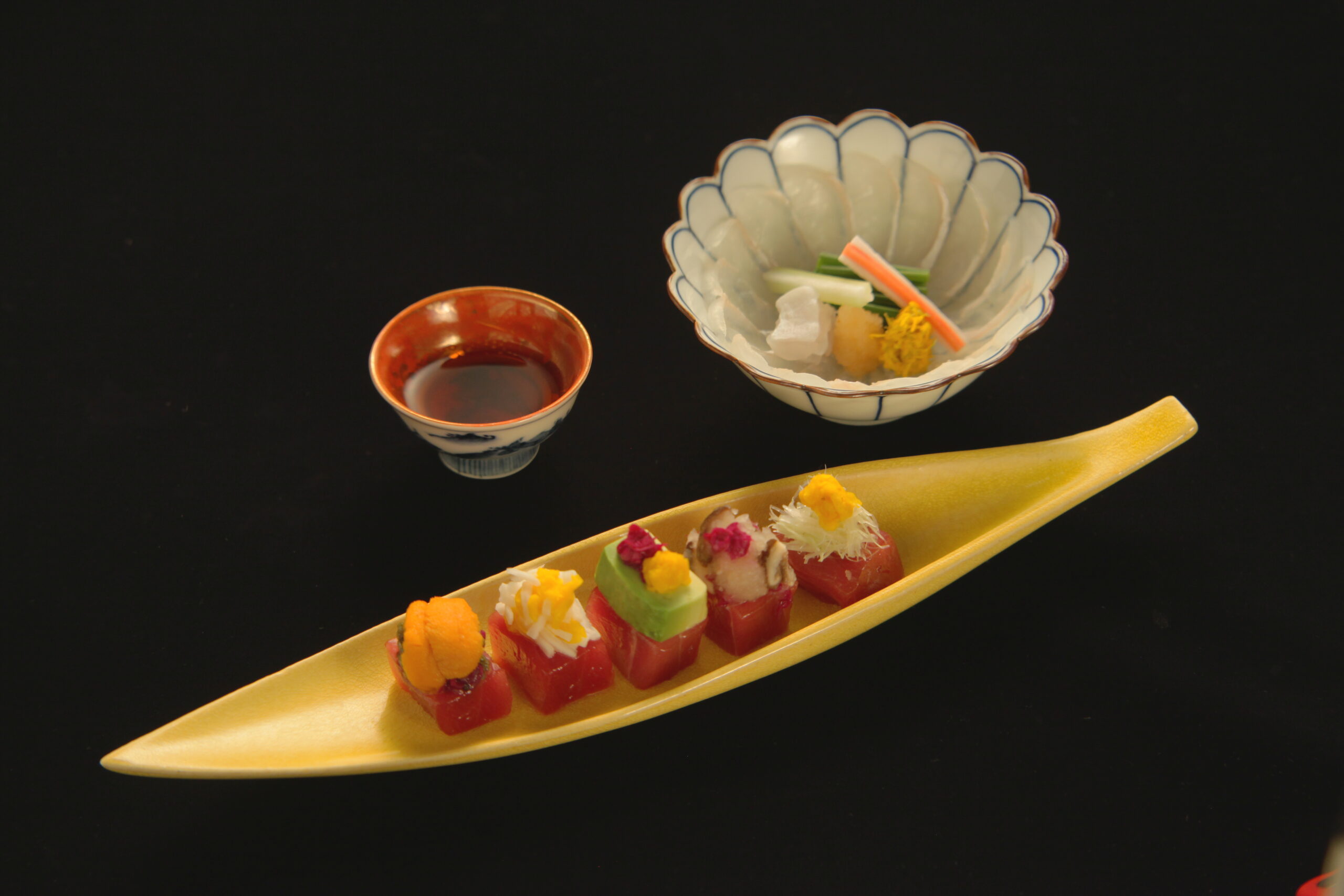 Auch Kugelfisch, Japans beliebte Winterspezialität, ist in verschiedenen Zubereitungen regelmässig vertreten. Jedes Gericht wird auf handgefertigtem Geschirr serviert und unterstreicht das Erlebnis japanischer Gastlichkeit, bei dem jedes Detail auf Harmonie ausgelegt ist.
