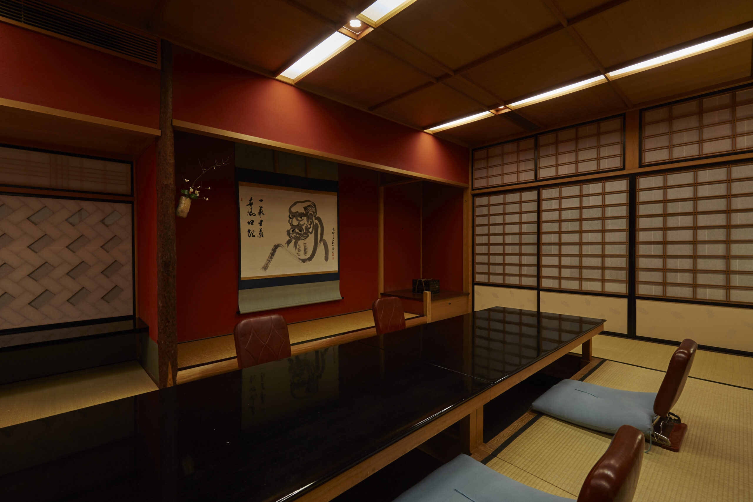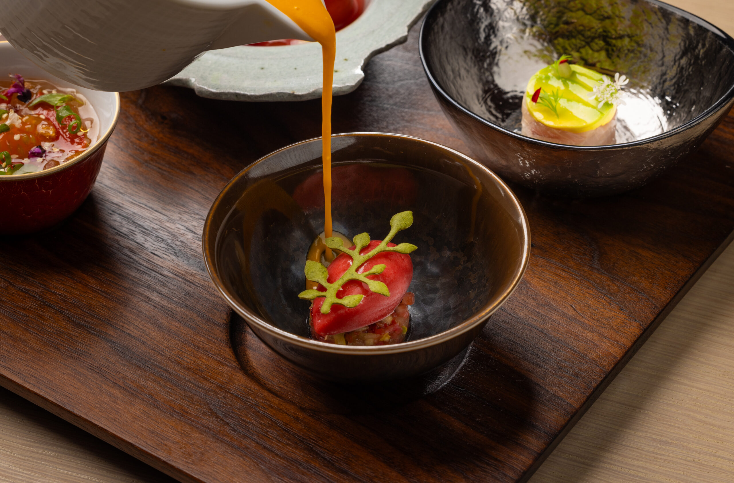 Papierschirme, Schiebetüren und Tatami-Matten schaffen intime Speiseräume, während Laternen und Räucherwerk zur ruhigen Atmosphäre beitragen. Saisonale und mikro-saisonale Zutaten prägen das Menü, das monatlich wechselt und elf sorgfältig komponierte Gänge umfasst – darunter oft feines Sashimi von Tintenfisch und Flunder.