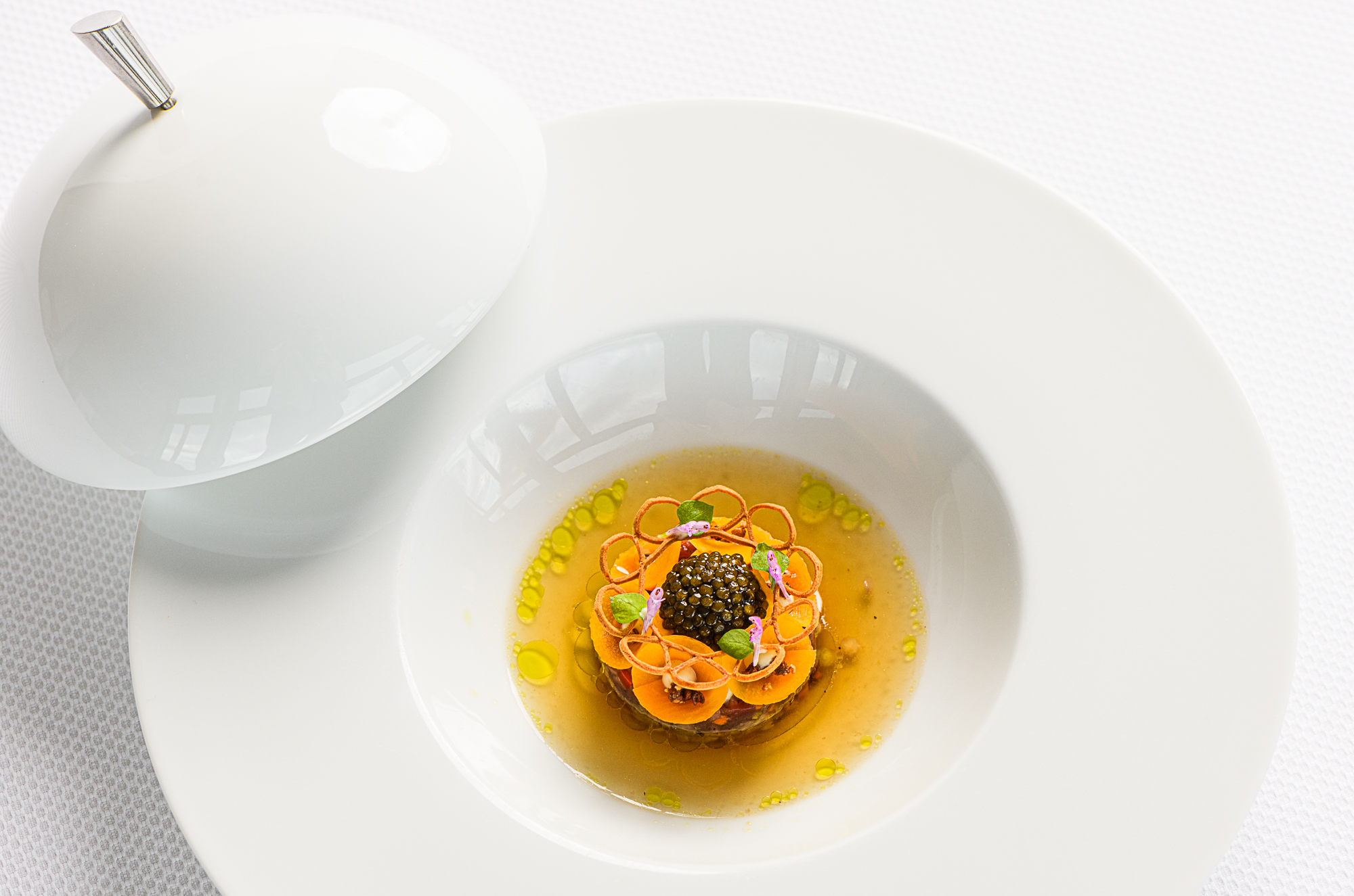 Weitere Menübestandteile können eine Neuinterpretation des französischen Klassikers Canard à la Presse, wilder Steinbutt mit Matsutake-Pilzen und Schwertmuscheln oder Languste mit Kaviar, Zitronenmelisse und Blumenkohlflan sein. Zum zarten Abschluss des Menüs werden Petit Fours serviert, etwa eine Brie-Tarte, Granatapfelgelee oder gesalzenes Karamell mit Schokolade.