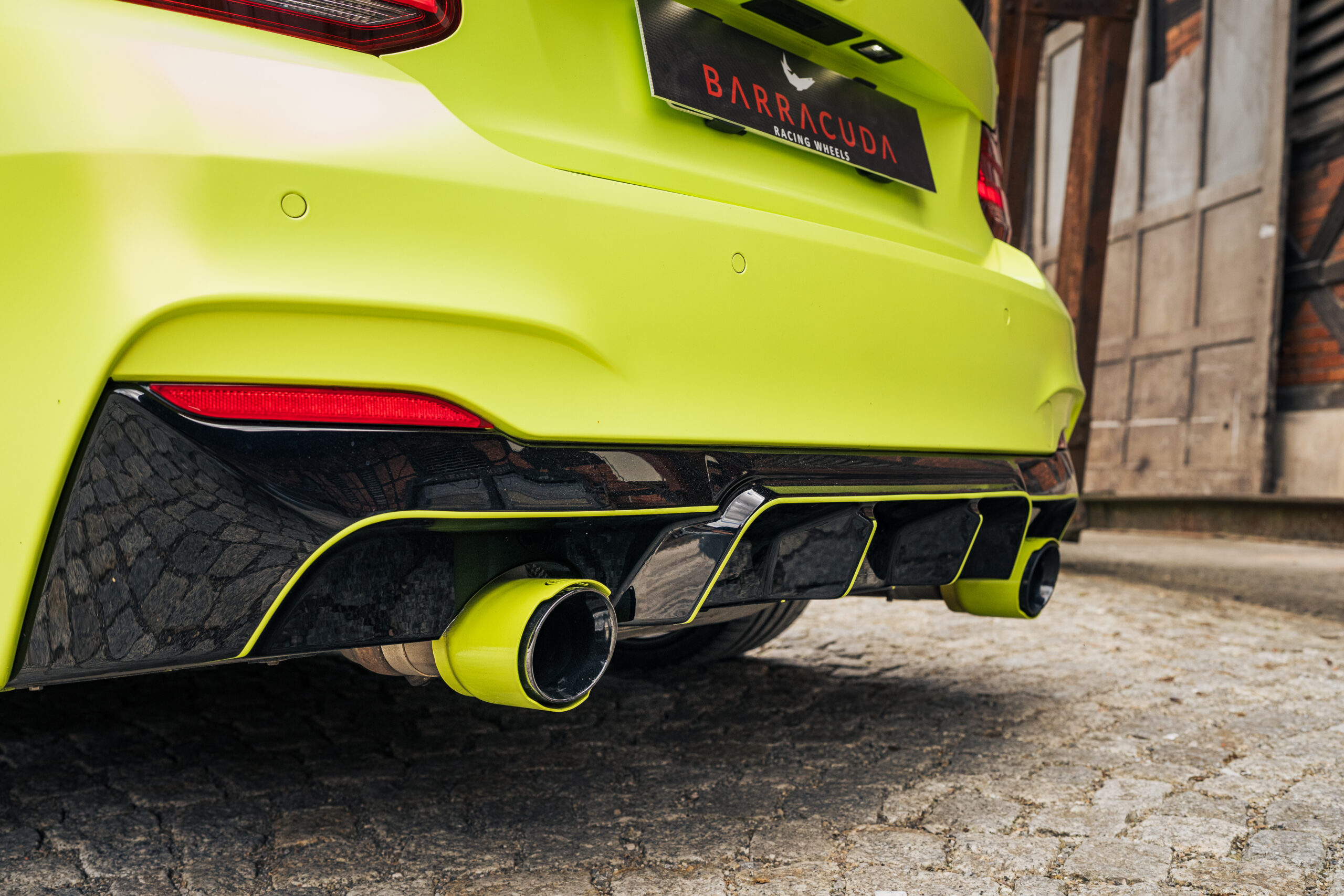 Ebenfalls absolute Eyecatcher sind die zwei Endrohre der neu installierten FOX-Sportabgasanlage. Sie verfügen über Ummantelungen, die passend zur Folierung eingefärbt sind. Ergänzend beschert die Anlage dem 184 PS starken Zweiliter-Turbo-Vierzylinder selbstverständlich einen kernigeren Klang. Als abrundenden Akzent gibt es Verspoilerungen aus dem BMW M Performance-Programm.