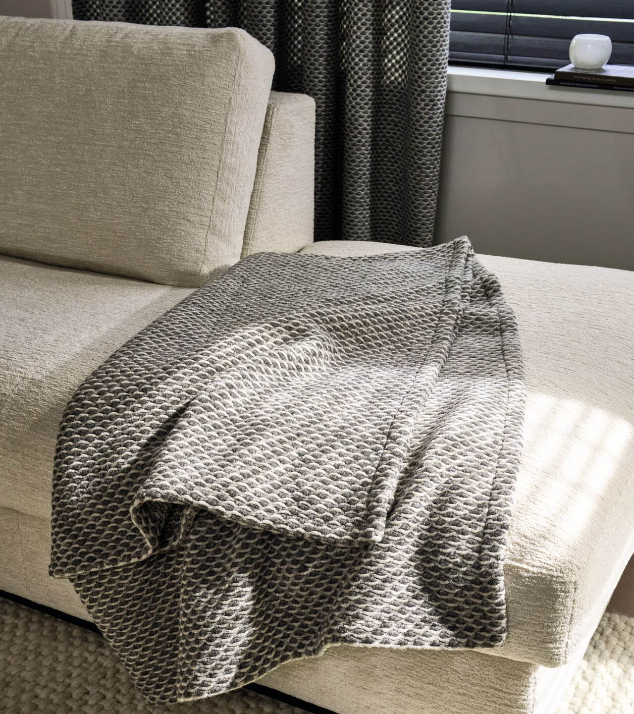 Zu den Highlights zählt CHAMONIX. Den Stoff ziert eine plastische Crewel-Stickerei auf feinem Fond. Das florale Motiv in klarer Farbigkeit interpretiert die klassische Kaschmirstickerei sehr zeitgemäss. Wie die Stickgarne verarbeitet sind, zeugt von höchster Handwerkskunst. CHATEL fasziniert mit grober Wollstrick-Optik – und das nicht nur als Dekorationsstoff, sondern auch als anschmiegsames Plaid, perfekt für wohnliche Rückzugsorte.