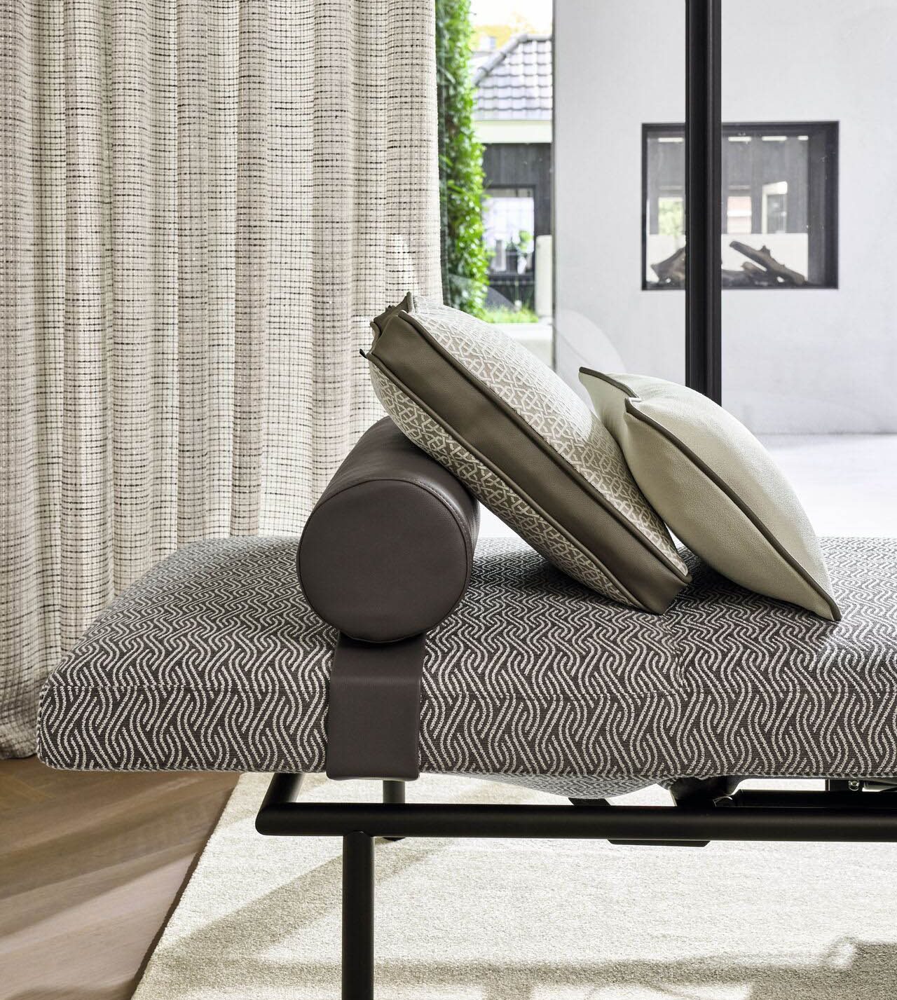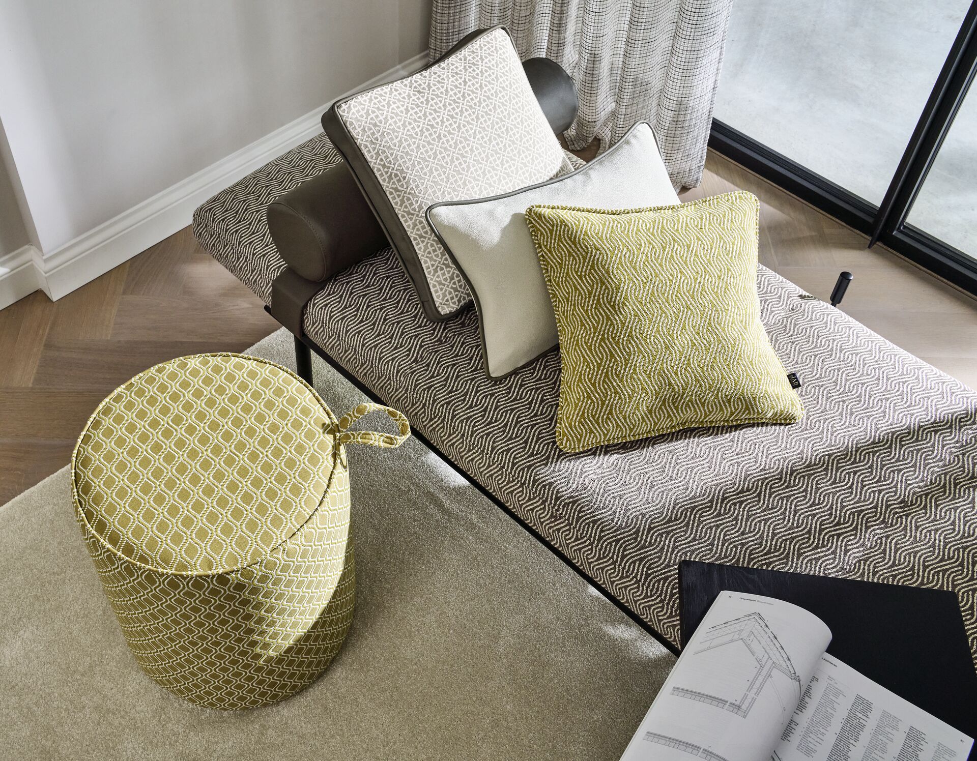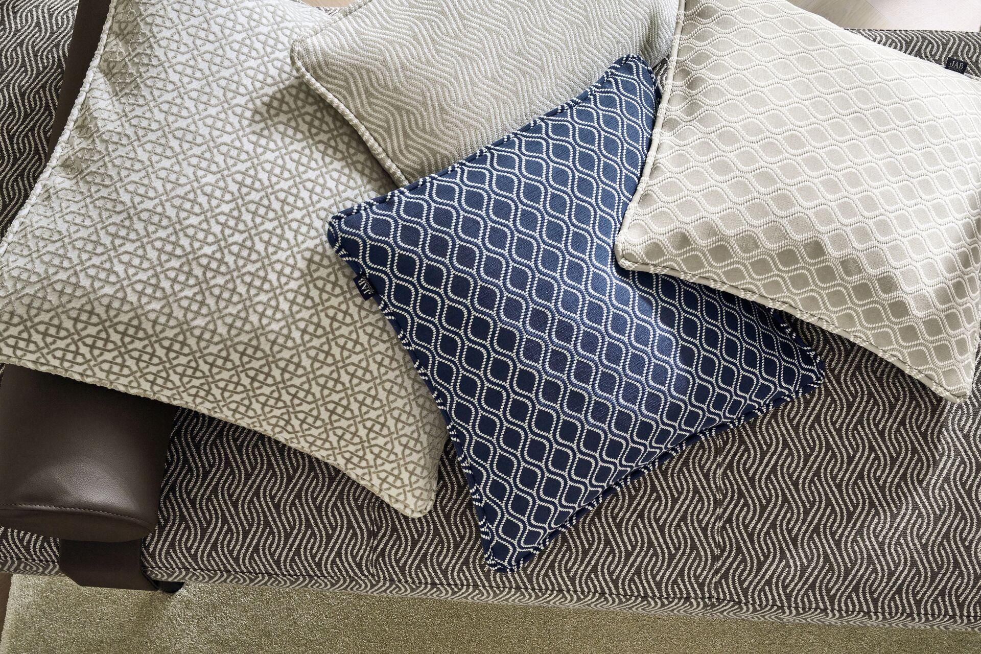 Grafische Musterungen, teils mit subtiler Midcentury-Anmutung, prägen den Charakter der Kollektion. Das lineare Dessin von BROOKLYN beeindruckt mit seiner dreidimensionalen Struktur und changierender Optik. Die Bezugsstoffe AUCKLAND, HAMILTON und WELLINGTON setzen mit Mustern in Flecht- und Medaillonstrukturen moderne Akzente.